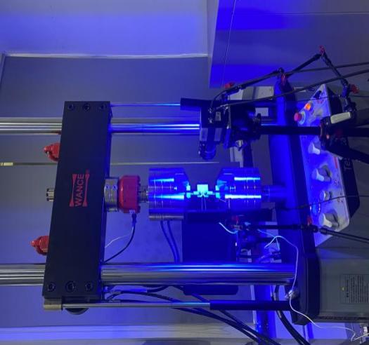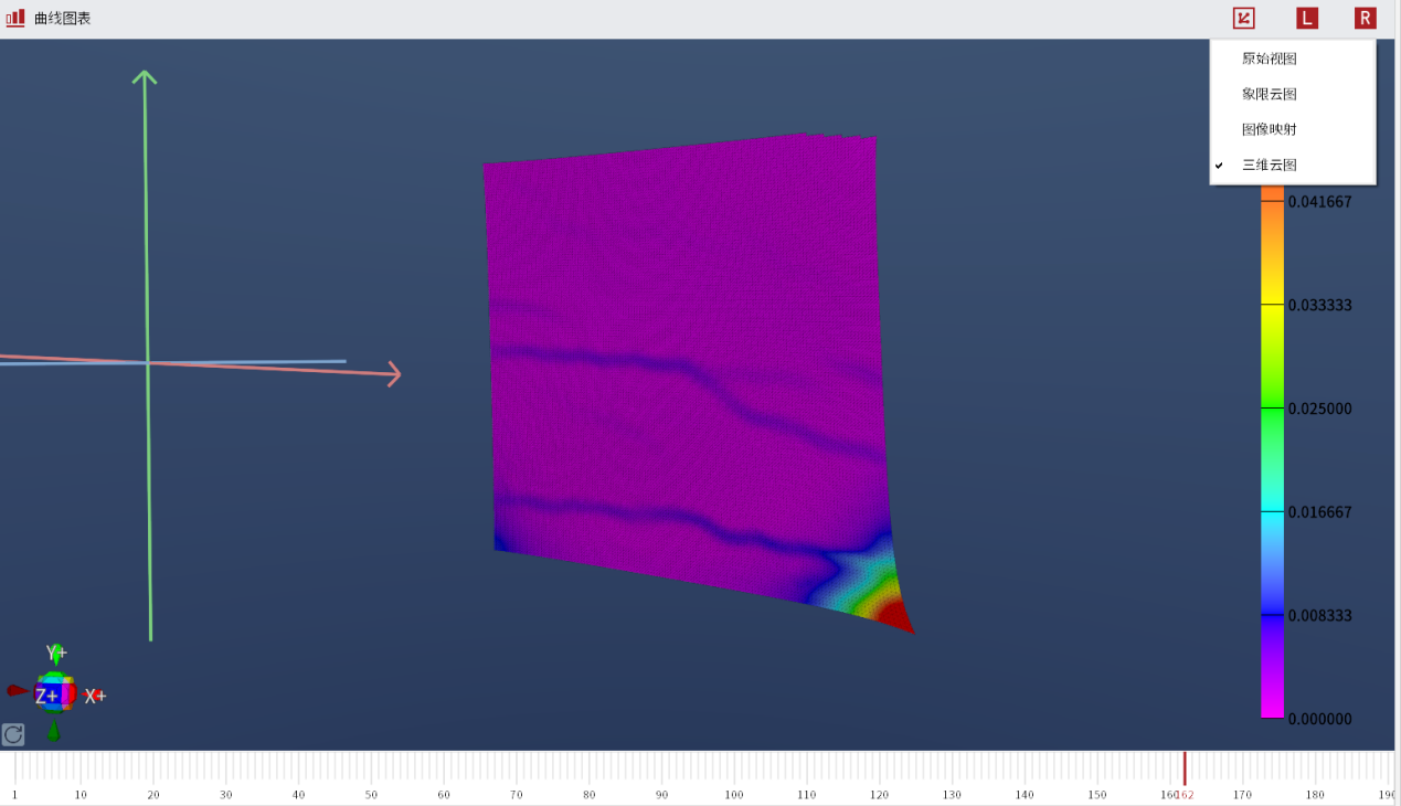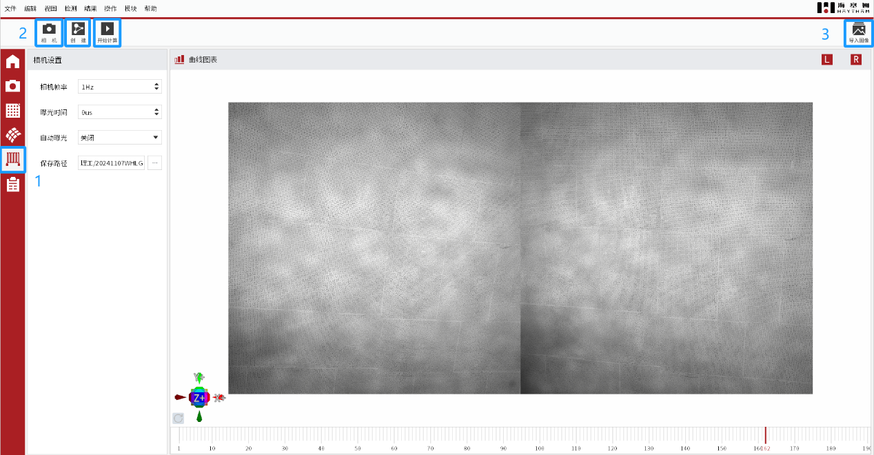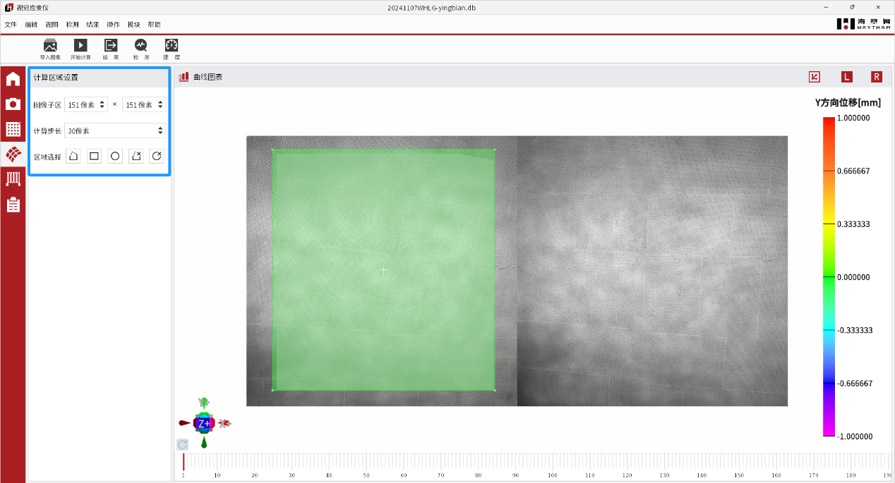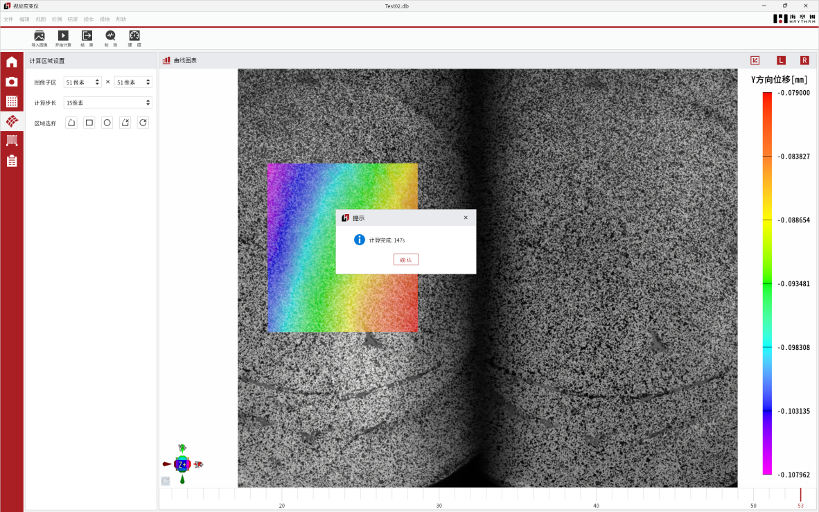 调节视频引伸计设备的物距角度,使其系统位于合理位置上并进行标定作业。对待测试件表面进行特征点布置(标准标记点/手绘标记点)。